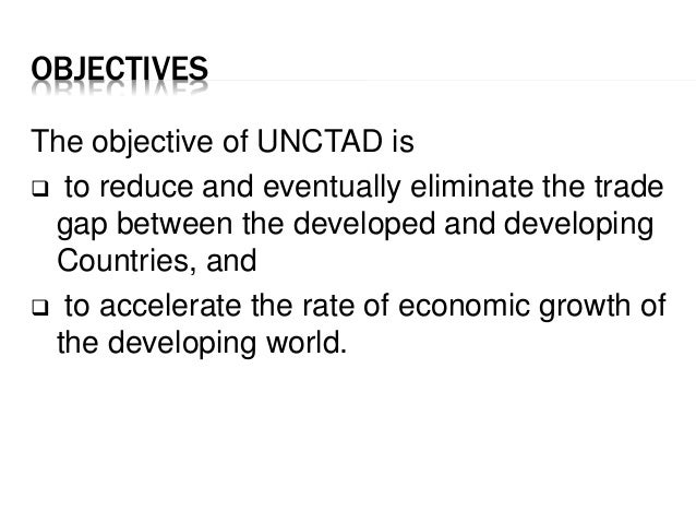 The objective of unctad is (a) to reduce and eventually eliminate the trade gap between the developed and developing countries, and (b) and to accelerate the rate of economic growth of the unctad. This is a redirection page.